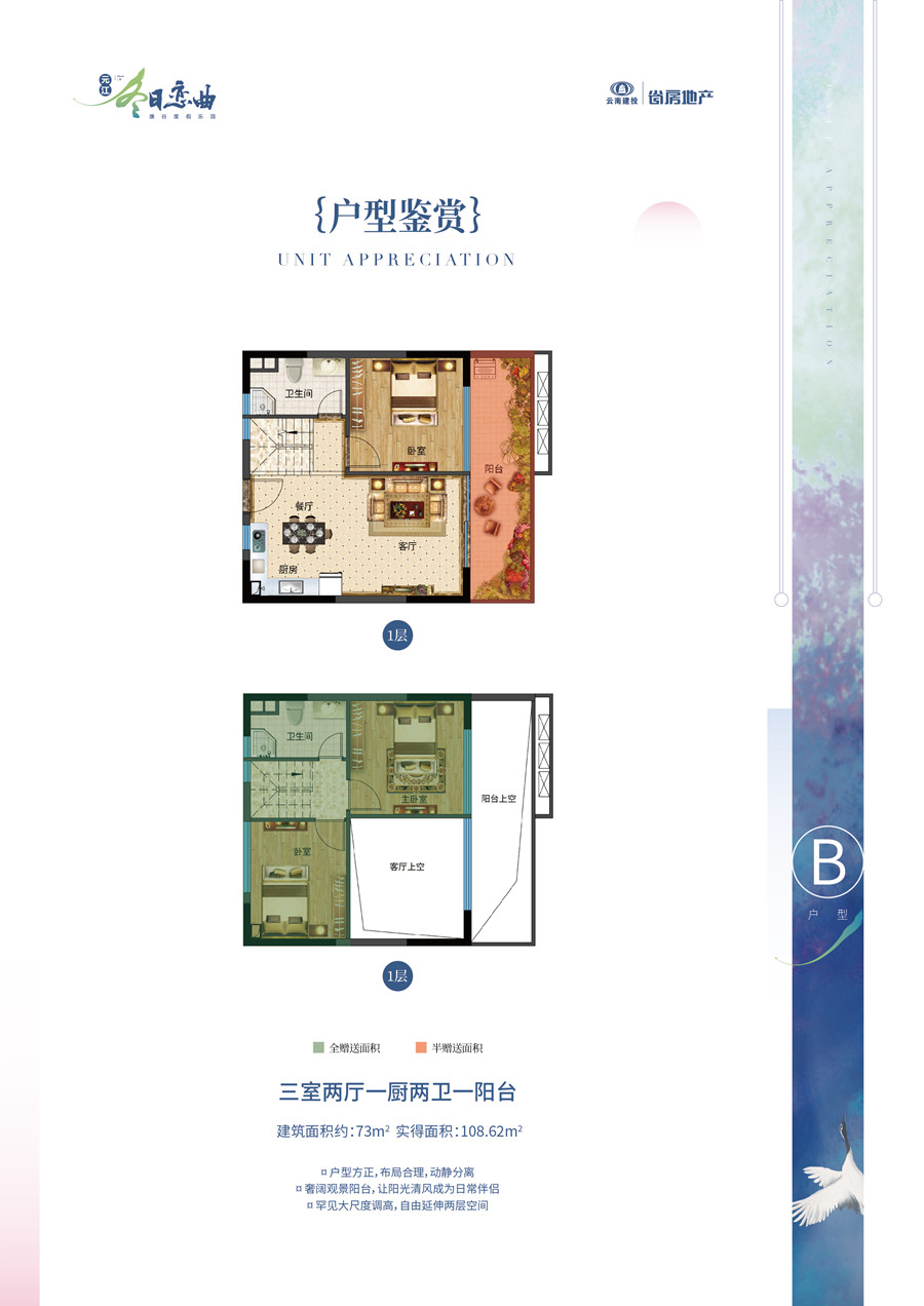 B戶型73㎡3室2廳1廚2衛(wèi)+1陽臺=108.62㎡