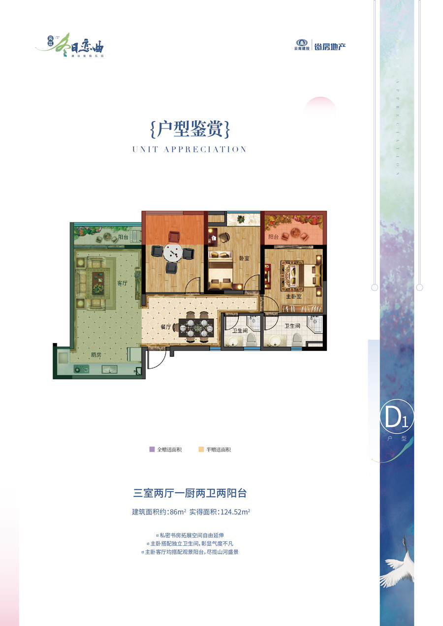 D1戶型86㎡3房2廳1廚2衛(wèi)+2陽臺=124.52㎡